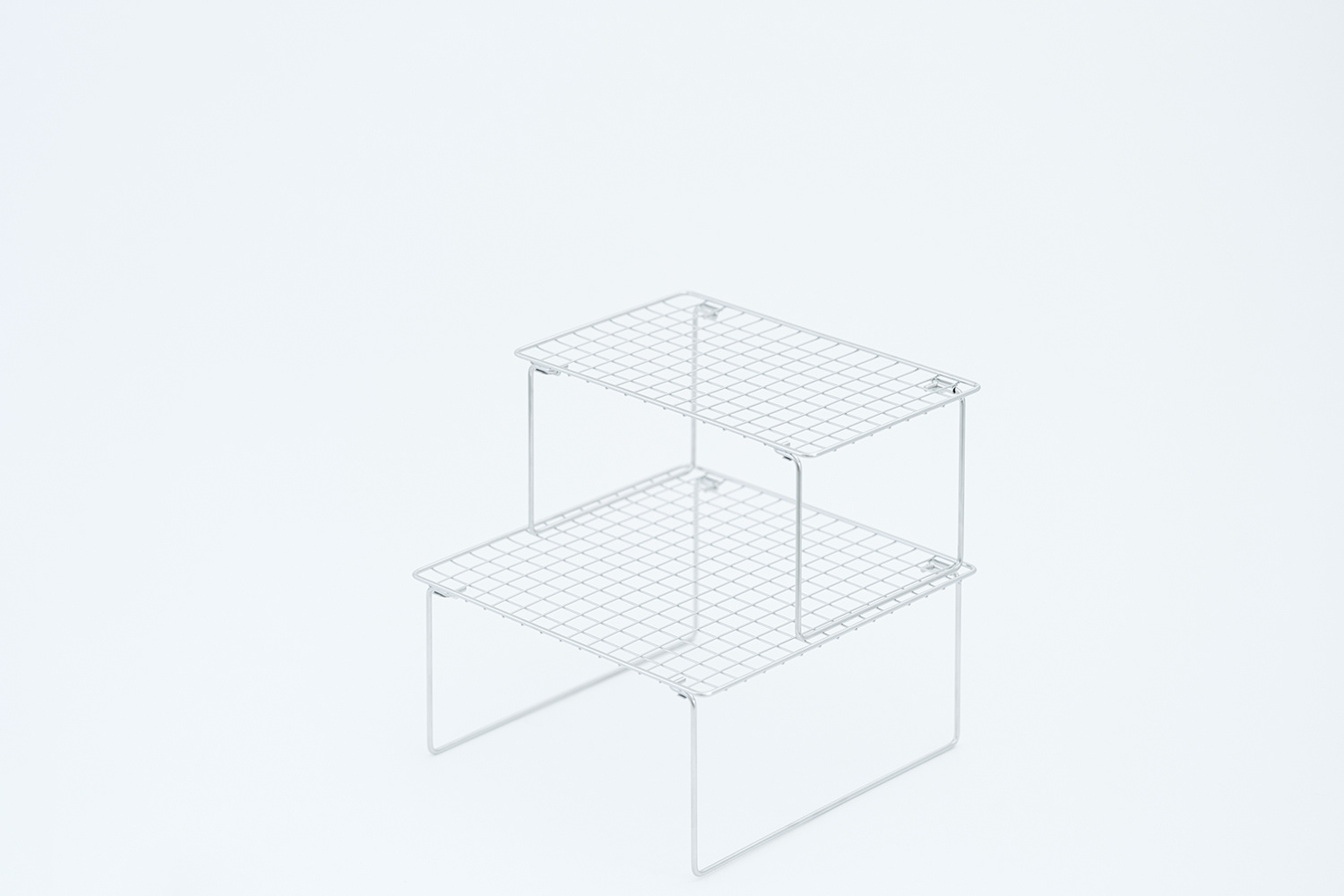 洗剤ボトル、洗剤のリフィルパック、フライパン、寸胴鍋、靴など様々な高さのものを多層レイヤーで整理し、収納スペースを有効に活用できる折りたたみ式の棚。