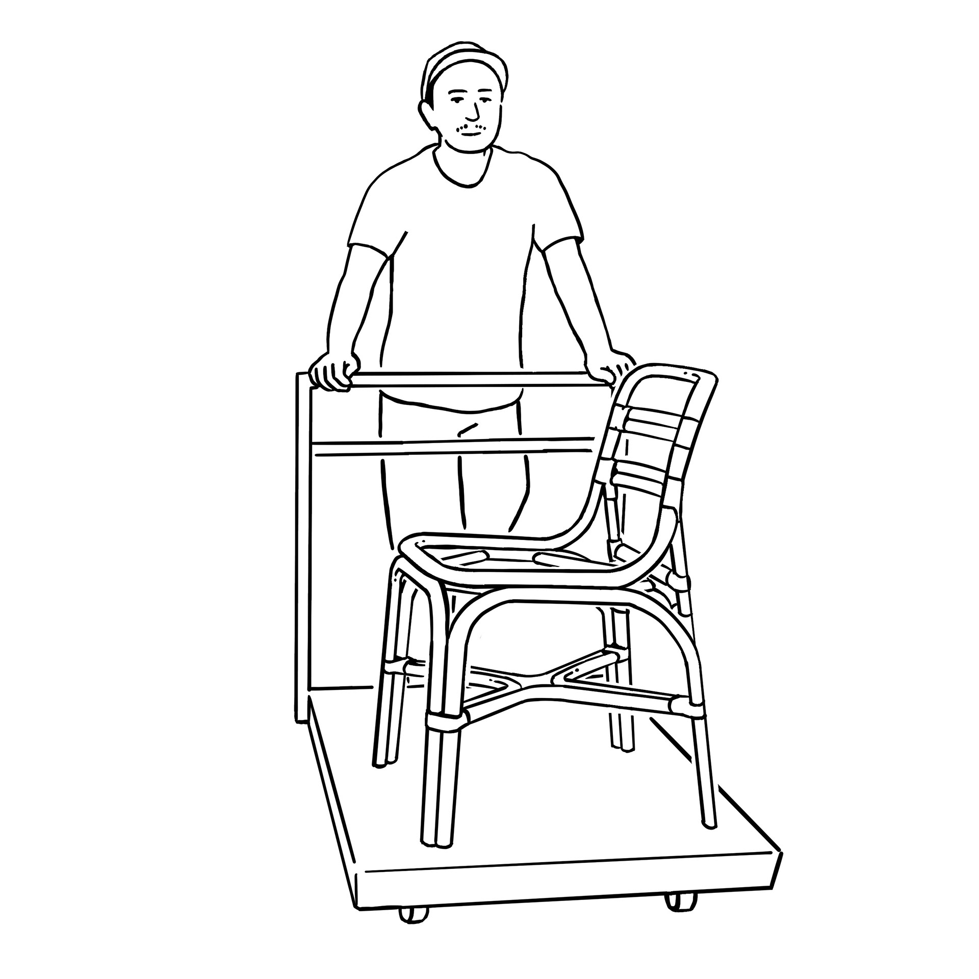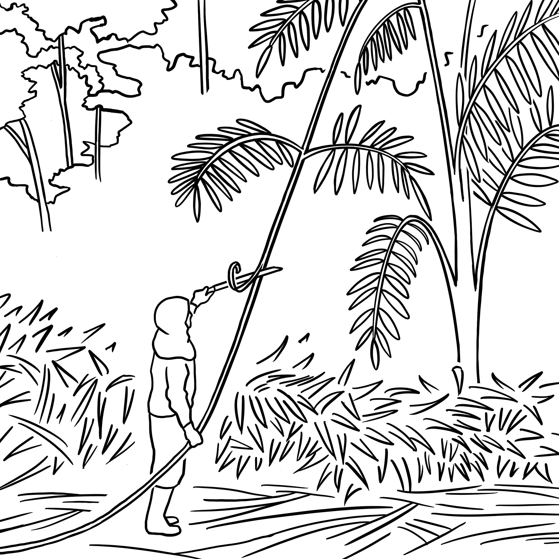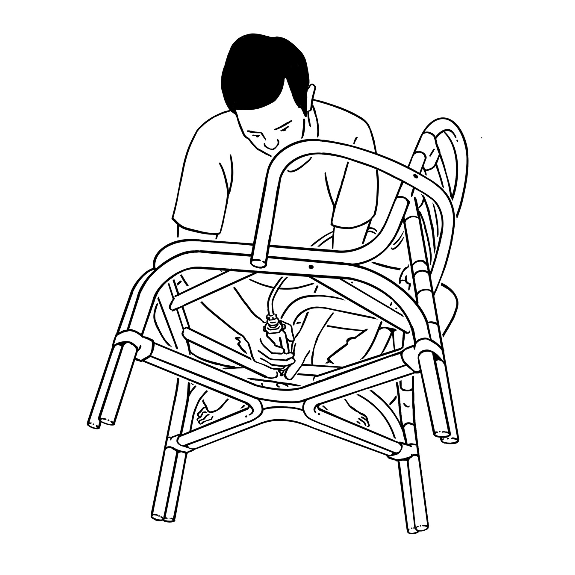 インドネシアで丁寧に生産されている籐家具の背景を伝えるため、材料調達過程、製造過程を働く人々の姿と併せて描いた。